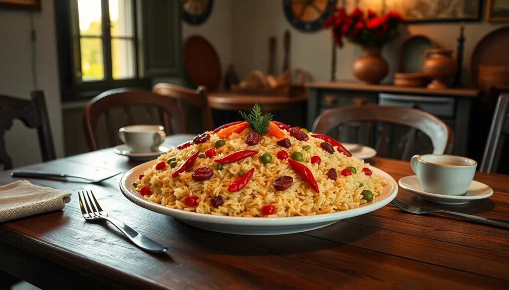 Este plato se cocina en el horno, lo que permite que el arroz adquiera un sabor ahumado y una textura crujiente en la parte superior. Su versatilidad permite variaciones que incluyen diferentes tipos de carne y verduras.