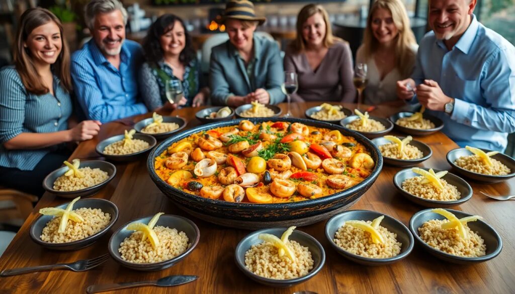- Interacción social: La paella al centro invita a todos a participar.